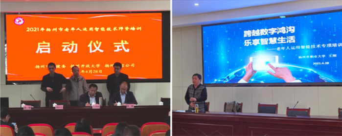 培训班开班前,市卫健委分别与扬州开放大学、中国电信扬州分公司签订了合作协议。副校长刘宏、市卫健委党委委员、市老龄办常务副主任江洪斌、中国电信扬州分公司副总经理赵景锐以及必赢官网继续教育学院负责人出席相关活动。