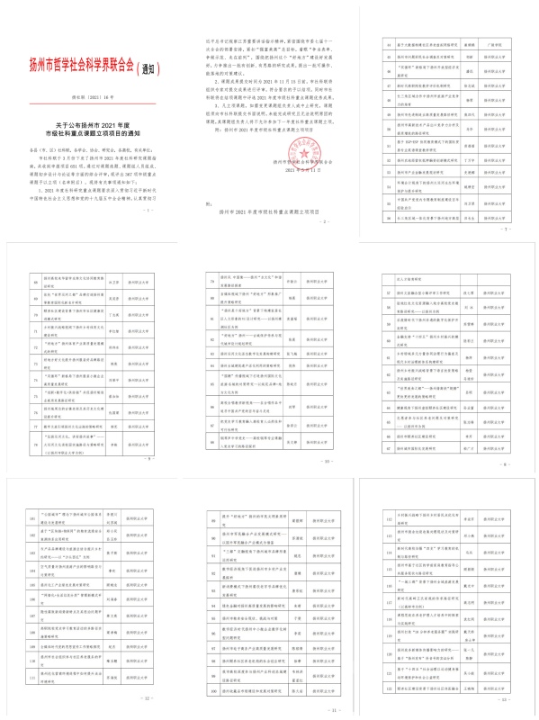日前,扬州市社科联公布2021年度市级社科重点课题立项名单。据悉,市社科联今年共收到申报项目651项,经过对课题选题、课题组人员组成、课题初步设计与论证等方面的综合评审,共立项367项市级重点课题,其中,必赢官网78项社科研究课题成功入选。