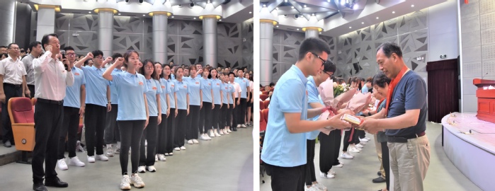 青蓝同携手,薪火永相传。在鲜艳的党旗下,今年刚入党的30名师生党员代表举起右拳,在华炜的带领下进行庄严宣誓。佩戴着“光荣在党50年”纪念章的老党员代表赠书寄语新党员代表,鼓励他们努力奋斗、矢志前行。为促进青年党员教师成长,校党委委员还与7位校中青年学术带头人、优秀青年骨干教师在政治引领、决策咨询、支持帮助、服务保障四个方面结对共进,签订了结对协议书,7位青年党员教师向校党委委员递交了目标责任书。