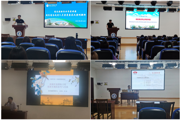 6月24日和6月25日下午,肖洁受邀为2019级应用英语专业的学生做了题为《以扬州为例,从旅游营销的角度浅谈打造国际文化旅游名城的思考与实践》学术讲座。肖洁首先介绍了当今旅游的大背景——大众旅游、全域旅游、智慧旅游、高品质发展和文旅融合。肖洁详细分析了扬州以前的景区营销和现在的大运河文化带营销的区别和发展,着重讲授了如何在清明雨季宣传瘦西湖。通过案例分析、视频鉴赏等方式,肖洁对扬州建设国际文化旅游名城具备的条件、优势与存在的问题进行了解析,并提出了具体的营销策略与建议。