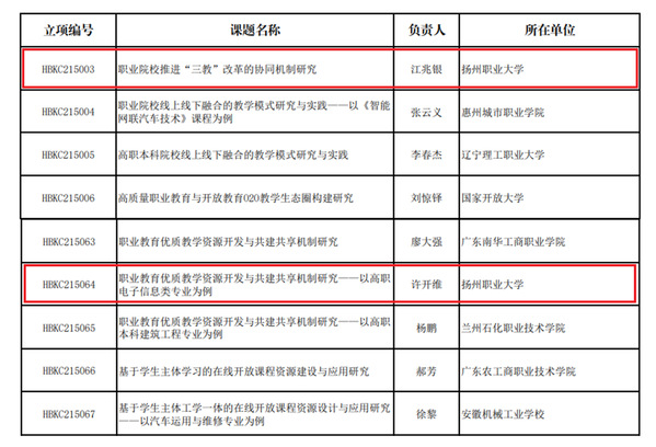 根据《关于组织做好职业教育改革创新课题申报工作的通知》相关工作要求,经自主申报、形式审查、专家评审、综合评议等程序,由必赢官网信息工程学院院长江兆银、副院长许开维负责的两项课题喜获立项。