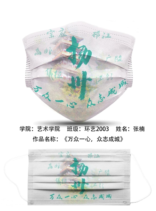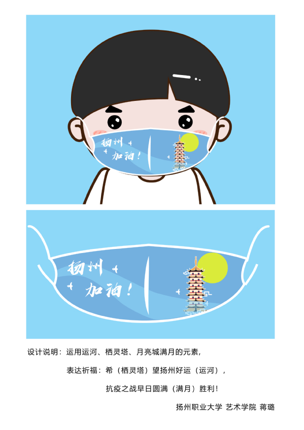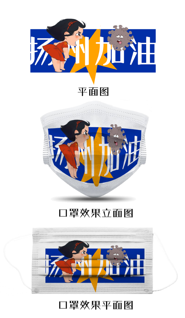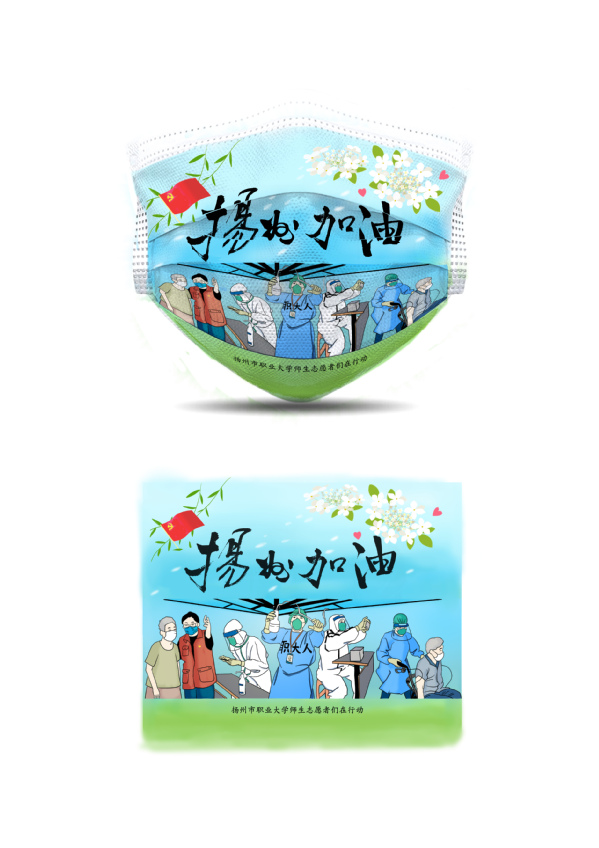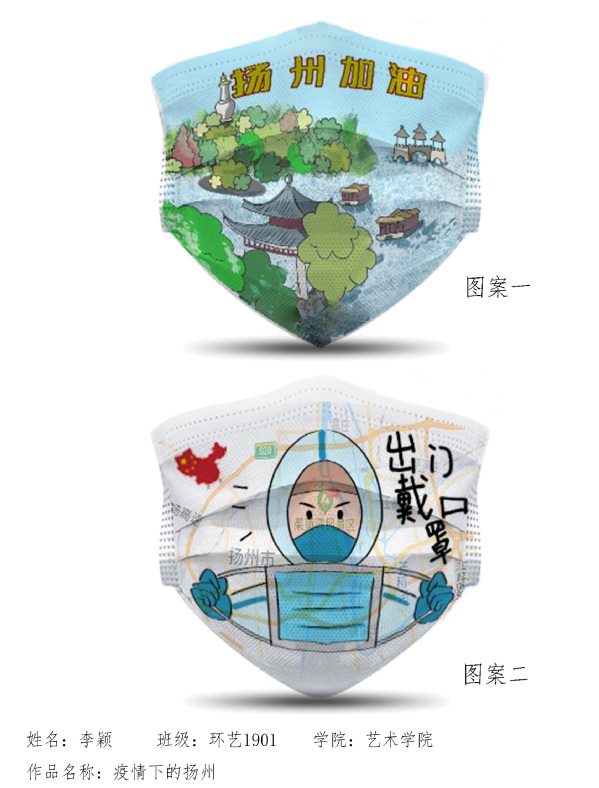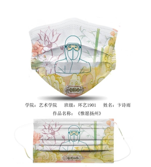 8月初,艺术学院发布了《众志成城 艺齐抗疫 “扬州加油”——抗疫口罩图案设计大赛》通知后,短短几天,共收到一百多幅来自师生及抗疫志愿者的作品。师生们从专业特色出发,将疫情防控宣传和爱国主义教育相结合,口罩设计丰富化,融入扬州地域文化,共同以设计为笔,为抗击疫情鼓舞加油。小小口罩上面,有“扬州加油,抗疫必胜”的呐喊,有“众志成城,抗击疫情”的决心,有“绿码”动物的温馨画面,也有对逆行英雄的赞美,还有对疫情过后安定平和生活的向往……这些作品表达出了对抗击疫情奋战在一线的“逆行者”由衷的敬意,凝聚抗击疫情的强大精神力量,传递战“疫”必胜的信心与决心。中国加油!扬州加油!