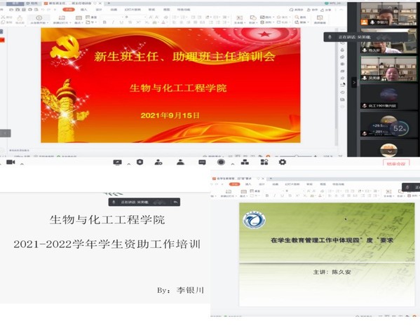 9月15日下午,必赢官网生物与化工工程学院召开了2021级新生班主任、助理班主任线上培训会。学院5名新生班主任、10名助理班主任参加了培训会。