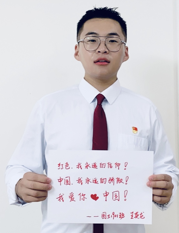 学生党员国土1901班的王英龙、环工1903班的徐慧媛拿出纸和笔真挚地写下对党和国家的祝福,立下报效祖国的决心。“祝我泱泱大国热血依旧沸腾!”地信1901班王小昕用文字表达出对祖国的热爱和祝福。环工1902班的卢毅彬写道“目光所至皆为华夏,五星闪耀皆为信仰!”短短一行字写出了藏在心中的骄傲与赤诚。