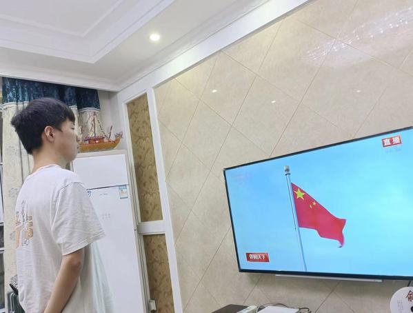 刚从部队退伍回来加入环工2101班的瞿亚星在观看完升旗仪式后深有感触,他说:“爱国爱国旗从来不是抽象的,而是具体的,它时时处处就在我们身边。”他自发走出家门,对着身边的国旗致敬。地信1901班的施大柯表示“哪里有国旗,哪里就有方向,哪里就是家!”“在党和国家的关心下成长是最大的荣幸与骄傲,祝祖国母亲生日快乐。”地信1901班的周鑫与红旗合影后说道。