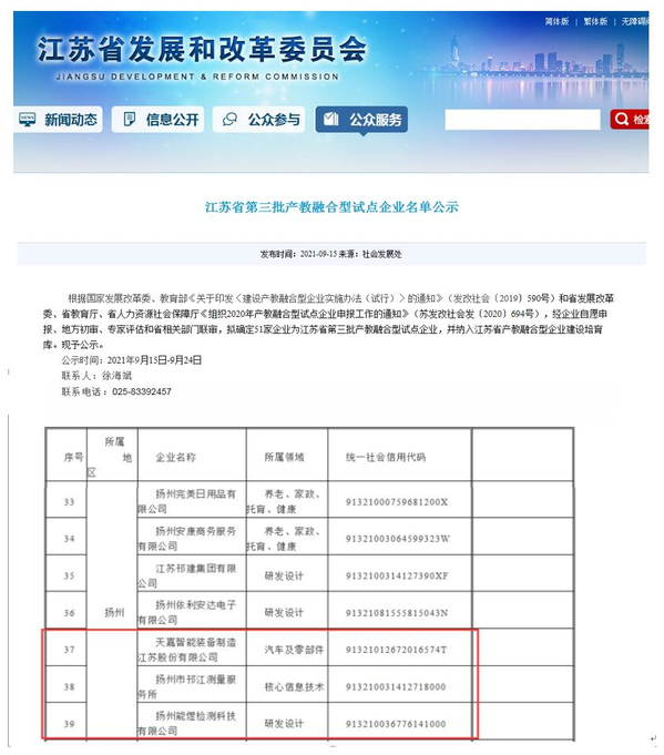 江苏省发展改革委、省教育厅、省人力资源保障厅近日联合发布了江苏省第三批产教融合型试点企业名单,必赢官网推荐的合作企业天嘉智能装备制造江苏股份有限公司、扬州邗江测量服务所、扬州能煜检测科技有限公司等三家企业被确定为全省第三批产教融合型试点企业,并纳入省产教融合型企业建设培育库。经过建设培育期后,满足条件的企业将向国家申报进入产教融合型企业认证目录,享受国家相关政策支持。
