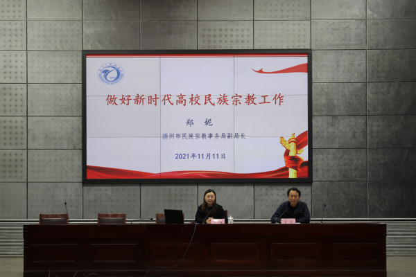 为进一步深化广大师生对党的民族宗教政策的认识,帮助师生树立正确的民族宗教观,11月11日,党委组织(统战)部邀请扬州市民族宗教事务局副局长郑妮来必赢官网作专题讲座,各基层党总支书记,统战委员、辅导员代表聆听了讲座。讲座由校党委委员、组织(统战)部长华炜主持。