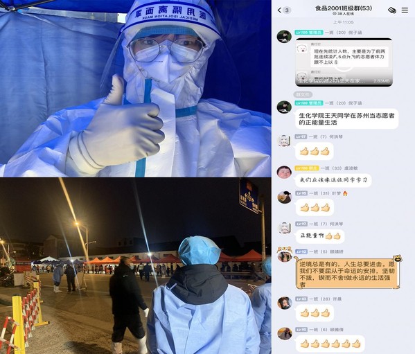 药技2101班同学一直关注苏州疫情,关心苏州籍未能返校的同学,王天同学志愿抗疫的视频深深感动了他们。这个视频很快从药技2101班被转发到其他班级群,满满正能量在学院学生中接力传播。同学们从小小视频中领略了抗疫的风采和青春的担当。