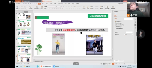 王惠老师结合当下疫情防控形势,深入分析了疫情下在生理、心理、认知和行为方面可能会出现的不良反应,详细解释了如何辨别心理问题的严重程度,以及如何进行有效的心理调适。最后,王惠老师还为同学们提供了行之有效的专业指导,介绍了调节情绪的“心处方”:一是理性接纳负面情绪;二是合理宣泄负面情绪;三是科学调控情绪。