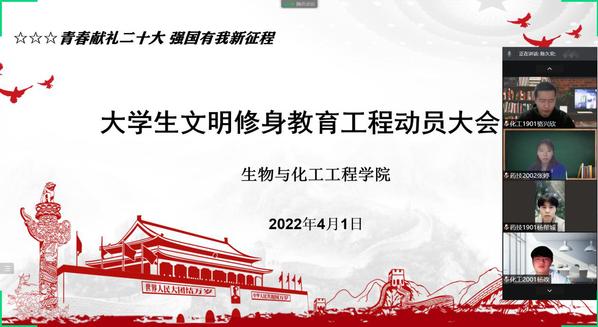 近日,生物与化工工程学院549名同学齐聚“云端”,参加文明修身教育工程动员会。会议由学院学生会主席倪子涵同学主持。学院党总支副书记陈久安参加活动。