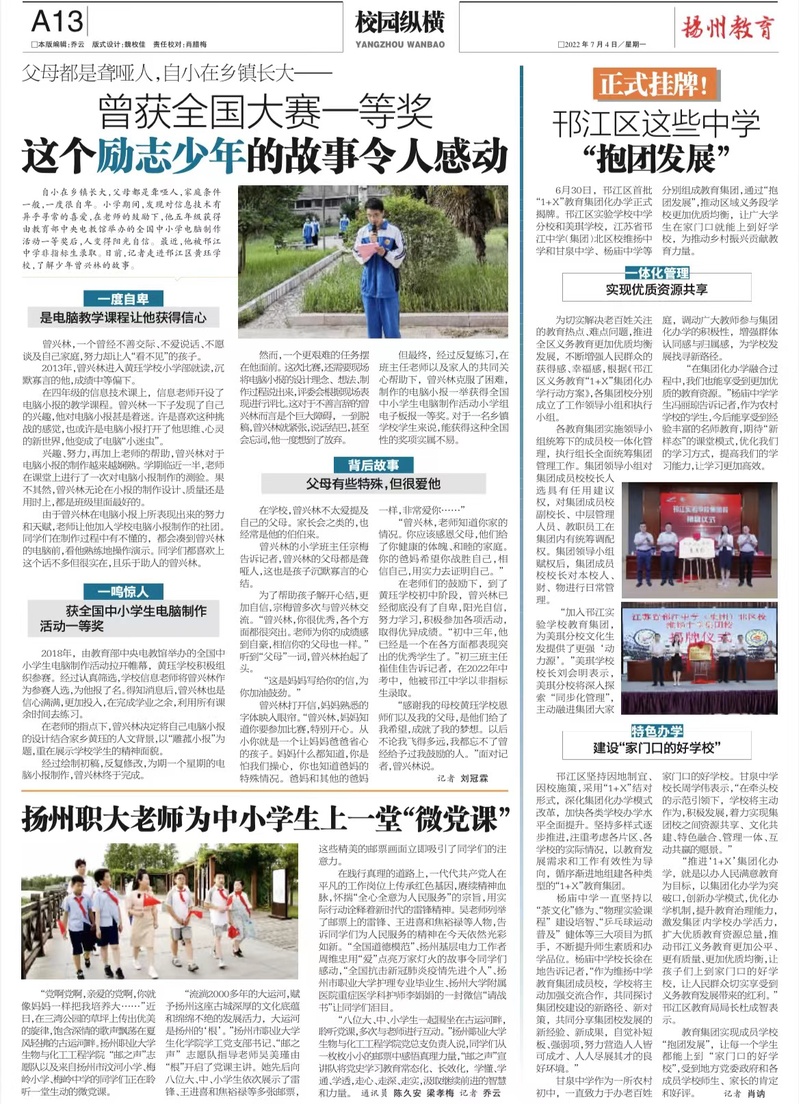 【扬州晚报】扬州职大老师为中小学生上一堂“微党课”