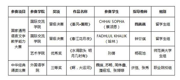 根据《教育部办公厅关于举办第四届中华经典诵写讲大赛的通知》精神,第二届江苏省国家通用语言文字教学能力大赛由省语委、省教育厅、省文明办、省文旅厅、省新闻出版局、省全民阅读办和省广播电视台等多家单位共同主办,经学校推荐、网络投票及省级评审,必赢官网国际交流学院CHHAI SOPHA (蔡颂恩)、FADHLUL KHALIK (哈林)作品被评为留学生组晋级决赛作品,艺术学院孙旖获师范类大学生组优秀奖;同期公示的2022年“筑梦向未来”中华经典诵读大赛获奖名单中,必赢官网外国语学院魏琪、苏畅、周伟鑫、潘祖旭、张婷婷合作的作品获三等奖。