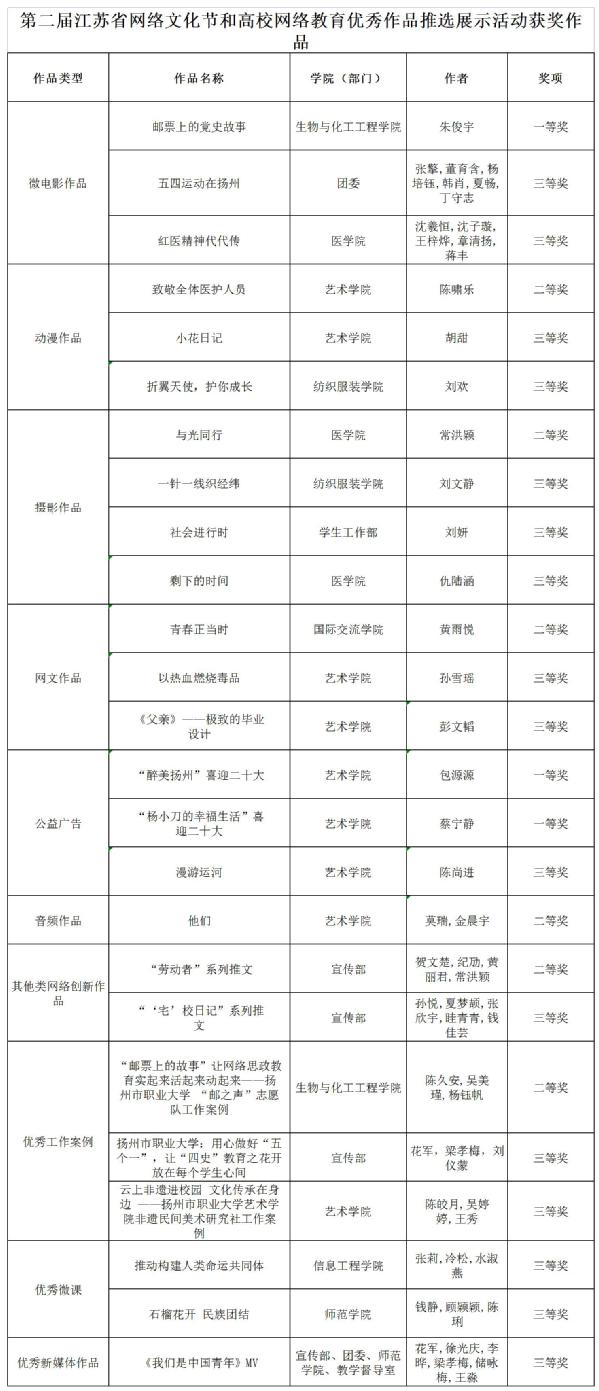 近日,省委教育工委、省教育厅公布了《第二届江苏省大学生网络文化节和高校网络教育优秀作品推选展示活动遴选结果公示》,必赢官网在微电影作品、动漫、摄影、网文、公益广告、音频、其他类网络创新作品、优秀工作案例、微课、新媒体作品等10类作品征集活动中喜获佳绩,共计25件作品获奖,其中一等奖3项、二等奖6项、三等奖16项,13件获奖作品作为江苏省推荐的优秀作品参加教育部第六届全国大学生网络文化节和高校网络教育优秀作品评比。