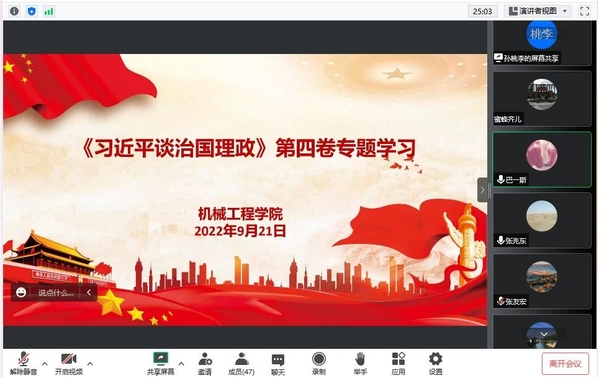 9月21日,机械学院党总支召开集中学习会,专题学习《习近平谈治国理政》第四卷,学院全体党员参加会议。