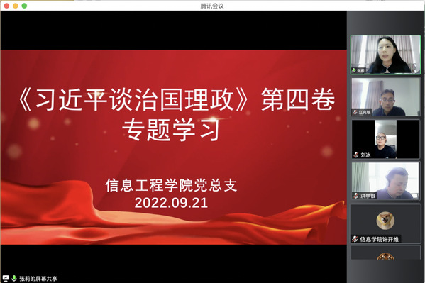 9月21日下午,信息工程学院举办线上学习会,学院党总支负责人对《习近平谈治国理政》第四卷进行了导学,她对《习近平谈治国理政》第四卷的时代背景和相关内容是什么、为何要学习、如何学习进行了解读,并建议大家结合《习近平谈治国理政》前三卷一起学,结合党的十九届五中、六中全会精神和百年党史一起学,结合疫情防控的社会实践学,结合本职工作学……本次导学对全体师生进一步了解《习近平谈治国理政》第四卷的核心要义和学习方法有良好的启发,学院全体教职工七十余人参加了此次学习会。