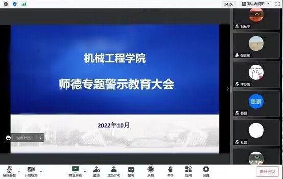 为进一步增强教师的责任感、使命感、荣誉感,明确师德底线,规范职业行为,营造风清气正育人生态,机械学院于10月12日通过线上会议形式,召开师德师风警示教育大会,学院全体教职工参加。