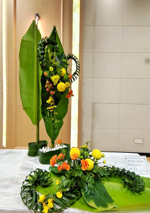 “花艺作品”由居萍教授带领学生共同完成,展现传统插花和现代插花的艺术效果。作品”永葆初心扬帆起航”就地取材,选用学生种植的花材进行设计和创作,营造出”初心”的造型,激励着我们要牢记初心使命,始终保持永不懈怠的精神状态和一往无前的奋进姿态,扬帆再启航,为实现中华民族伟大复兴的中国梦接续奋斗。作品”花开中国梦”,用竹子、红掌等材料创作而成,象征着进入新世纪以来,在中国共产党的带领下,中国经济迅猛腾飞,人民生活丰富多彩,幸福日子节节高。近年来,学院积极推动岗课赛证融通,鼓励师生积极参与各项职业技能大赛和创新创业大赛,居萍教授连续多年指导艺术插花赛项,带领学生在专业课堂、实训室苦练技艺,多次获得省一等奖的佳绩。