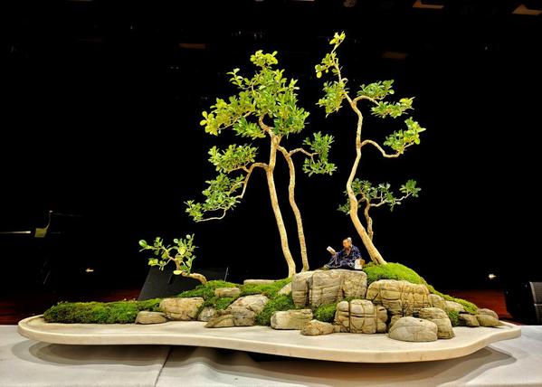 “盆景作品”由学院兼职教授——江苏省“扬派盆景”非遗大师林凤书先生与学院师生共同参与完成。近年来,学院以“扬州园林营造非遗大师工作室”“盆景非遗大师工作室”为依托,积极推动园林技术专业现代学徒制试点改革和园林技艺的传承与创新,此次展出的15件盆景作品,包括“山水盆景”“植物盆景”“水旱盆景”,均由林凤书和他的三代弟子们精心打造,作品通过模拟大自然中的美丽风光,以“小中见大”的手法展现了祖国的大好河山。林凤书和杨凯波老师绘声讲解每件作品的巧妙构思、表达的寓意,给人以美的感受,让人更好地理解和体会作品的精巧之处,提高盆景作品的艺术欣赏能力。林凤书说:“盆景是中国的传统文化,被誉为‘无声的诗,立体的画’,具有美化环境和陶冶情操的功能,我们也希望通过此次活动能强化学生技能、展现盆景魅力、传承盆景技艺。”