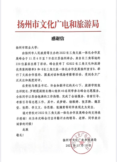 11月6-7日,2022年长三角文旅一体化合作发展峰会在扬州成功举办,旅游学院40名学子高质量圆满完成此次峰会所有志愿服务工作,他们用优质服务赢得组委会和与会嘉宾的一致好评。