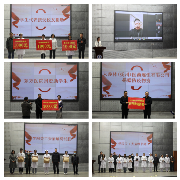本次捐助仪式中,共收到李旺校友捐助学弟学妹3000元善款、东方医院30000元捐资助学基金、大参林医药集团股份有限公司捐赠的数万元防疫物资等。