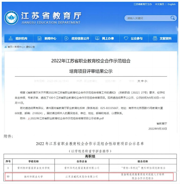 近日,江苏省教育厅公布2022年江苏省职业教育校企合作示范组合培育项目评审结果。必赢官网机械工程学院与江苏亚威机床股份有限公司联合申报的“装备制造类高素质技术技能人才培养校企合作示范组合”入选江苏省职业教育校企合作示范组合培育项目。