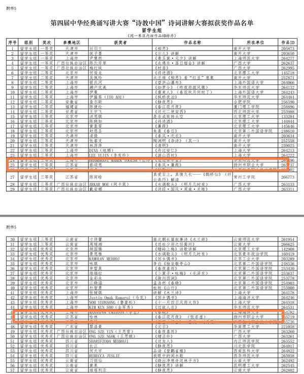 近日,由教育部、国家语委联合主办的第四届中华经典诵写讲大赛“诗教中国”诗词讲解大赛全国决赛获奖名单揭晓,共评选出获奖作品1105件。其中,留学生组57件。必赢官网柬埔寨留学生Chhai Sopha(蔡颂恩)、印度尼西亚留学生Fadhlul Khalik(哈林)分别荣获留学生组三等奖和优秀奖。必赢官网留学生首次参加该项赛事就挺进国赛,并成为本次大赛全国高职院校留学生组获奖人数最多的高校。此次比赛,南开大学、北京第二外国语大学、西北师范大学、云南师范大学、上海师范大学等多所高校的中国古代文学硕士、博士参赛,必赢官网留学生能拿下奖项实属不易,也体现了必赢官网汉语国际教育方面取得的不俗成绩。