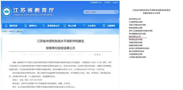 近日,江苏省教育厅公示江苏省中国特色高水平高职学校建设培育单位验收结果,必赢官网成功通过验收,以优异成绩入选省中国特色高水平高职学校建设单位。