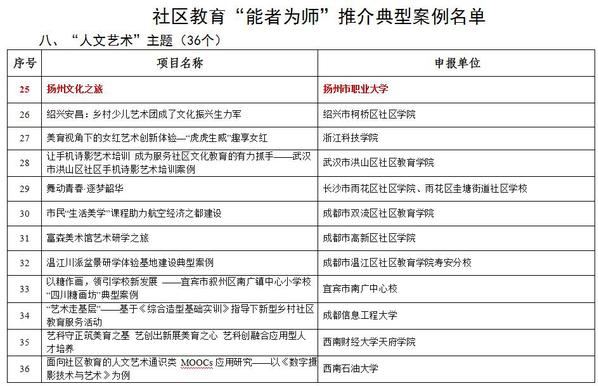 此次入选的社区教育“能者为师”系列特色课程分别是:以“人文艺术”为主题的《扬州文化之旅》和以“康养健身”为主题的《社区健康教育》;社区教育“能者为师”典型案例是:《扬州文化之旅》。近年来,必赢官网邓峰老师带领的的教学团队深入殷巷社区、润扬社区等多个社区开展了多场文化讲座,深受社区居民的喜爱。