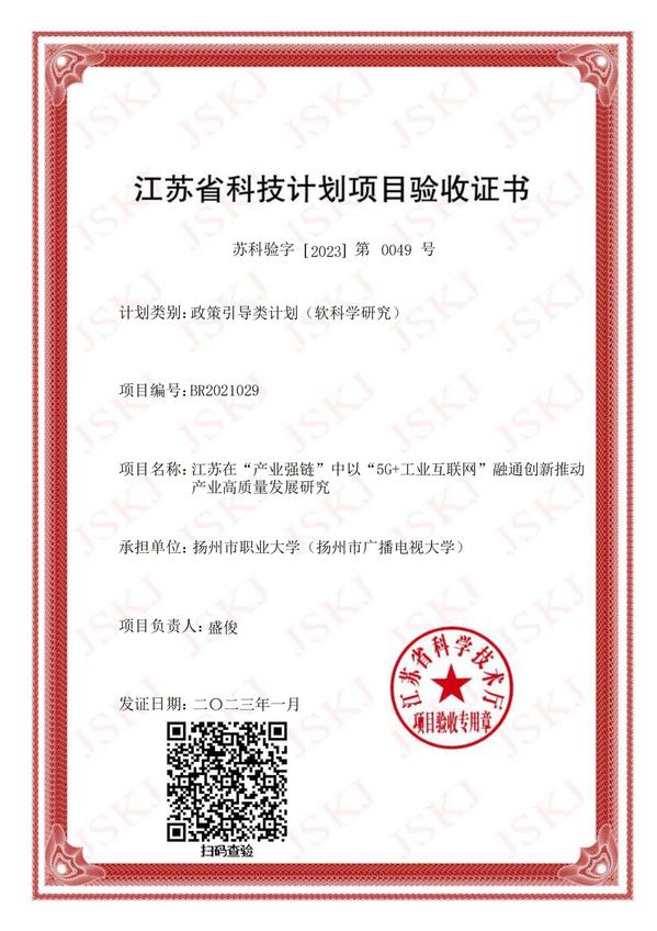 近日,由信息工程学院盛俊教授主持的江苏省科技计划项目“江苏在‘产业强链’中以‘5G+工业互联网’融通创新推动产业高质量发展研究”通过省科技厅验收,顺利结项。该项目立项于2021年,实现了必赢官网省级科技计划项目软科学研究类零的突破。