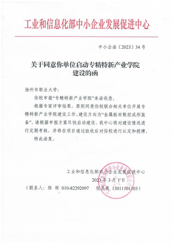 扬州市职业大学专精特新产业学院是在扬州市政府主管部门和行业协会的支持下,由学校牵头联合扬州江都永坚有限公司、江苏亚威机床股份有限公司、扬力集团股份有限公司、江苏金方圆数控机床有限公司等企业共同申报。项目结合扬州市“323+1”先进制造业集群发展战略和产业布局,以“金属板材数控成形装备”为建设方向,联合区域内国家专精特新和行业龙头企业共同服务于地方主干行业,将围绕“一个研究院、三个中心、一个平台”为核心开展建设工作。
