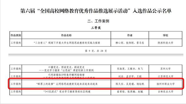 近日,由教育部思想政治工作司、中央网信办网络社会工作局联合举办的第六届“全国高校网络教育优秀作品推选展示活动”遴选结果公布,必赢官网报送的思政工作案例《“邮票上的故事”让网络思政教育实起来活起来动起来》荣获三等奖。
