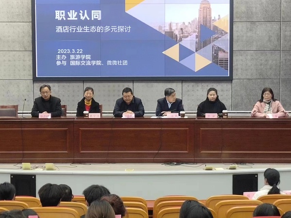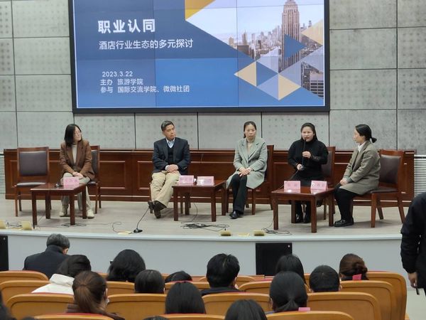 3月22日下午,旅游学院在映月报告厅举办了“职业认同——酒店行业生态的多元探讨”师生交流会,交流会由旅游学院举办,国际交流学院和微微社团共同协办。党委副书记、副校长许金如出席了交流会并致辞,国际交流学院院长沐卫萍、党总支副书记刘鎏及师生代表参与了本次活动。本次交流会特邀扬州市国际会议大使、扬州国际友好使者、现任WCCO专家委员会成员和志耕先生,原外交部钓鱼台宾馆管理局公关部经理贾宁江女士以及世界盲人联盟亚太区人权委员会主席、江苏省国际青年友好使者、青年长笛演奏家吴晶女士参与交流。