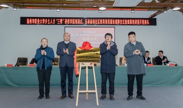 揭牌仪式上,吴书安、倪志峰、濮跃文、吴逊共同为扬州市乡土人才“三带”研修学院培训点揭牌,卢子华、徐宽兴、胡程辉、王银鑫共同为“乐享桑榆社区教育培训基地”揭牌。