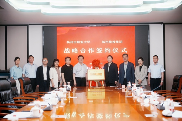 会上,刘宏与旅投集团陈万庆董事长签署了校企合作框架协议,国际交流学院党总支书记陈峰与瘦西湖温泉度假村总经理潘雅丽共同为“扬州市职业大学国际交流学院就业实习基地”揭牌。