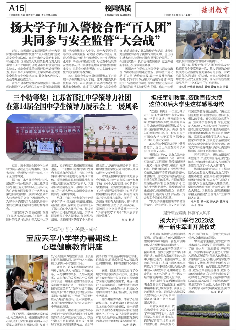 【扬州晚报】担任军训教官、资助宣传大使 这位00后大学生这样感恩母校