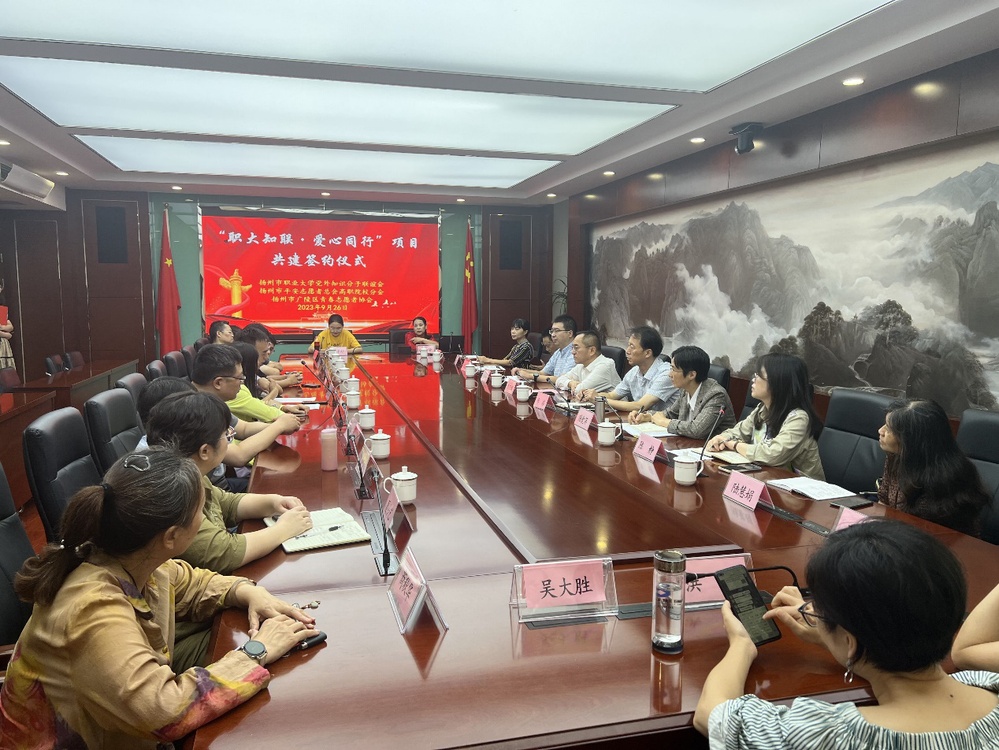 近日,必赢官网党外知识分子联谊会(职大知联会)与扬州市平安志愿者总会高职院校分会、扬州市广陵区青春志愿者协会在崇德楼316会议室举行共建签约活动。校党委副书记陈亚鸿出席并讲话,校党委委员、组织(统战)部部长华炜,机关党总支负责人和校知联会部分会员参加了此次活动。