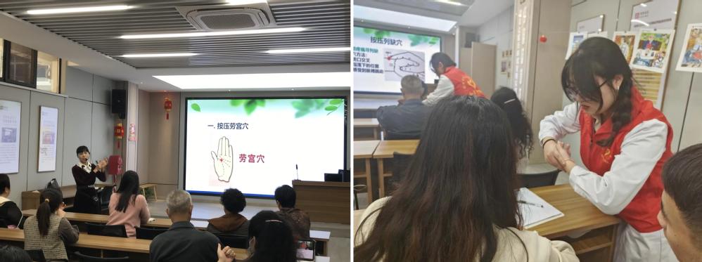 医学院苏兰娣老师采取理论教学与实操教学相结合的方法,针对肩颈部、腰部、上肢及下肢等部位,向大家传授了高血压、颈椎病、失眠、腰部疼痛等疾病的常见穴位按摩保健方法,大家边听边学边操作,并积极提出自己的问题和看法,现场气氛十分活跃。