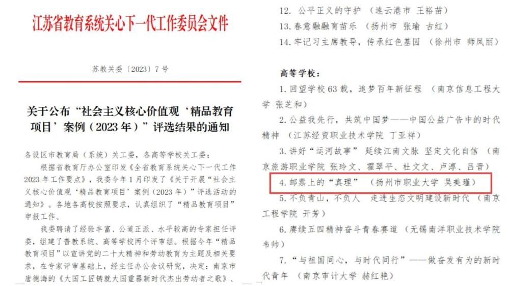 近日,江苏省教育系统关工委印发《关于公布“社会主义核心价值观‘精品教育项目’案例(2023年)”评选结果的通知》,必赢官网关工委报送的《邮票上的“真理”》项目获三等奖。该项目视频是由生物与化工工程学院制作,生化学院学工党支部书记、“邮之声”志愿队指导老师吴美瑾主讲。
