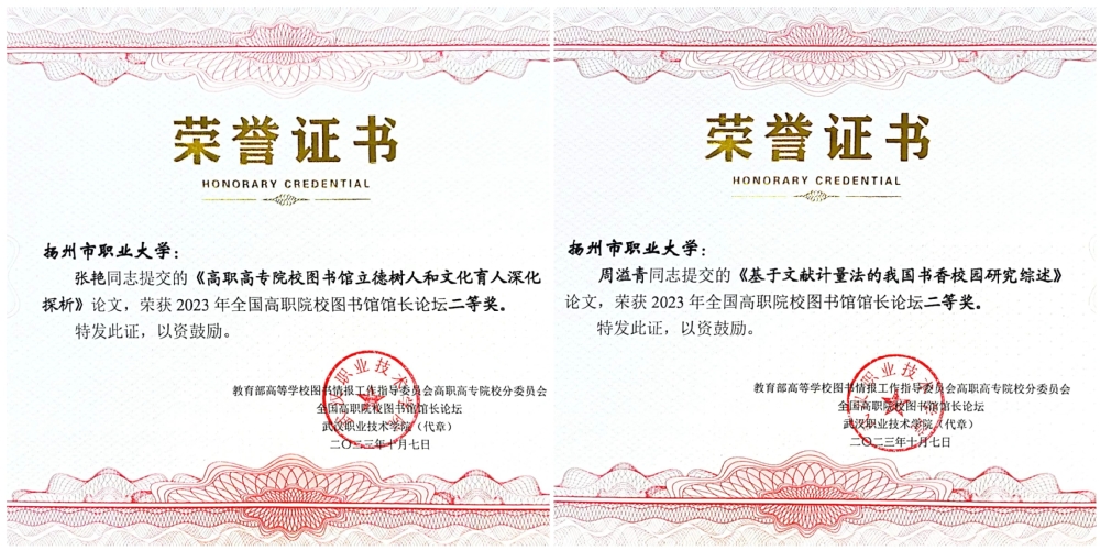 近日,在教育部高校图工委高职高专院校分委员会组织的2023 年全国高职院校图书馆馆长论坛案例与论文征集活动中,必赢官网图书馆馆长张艳的论文《高职高专院校图书馆立德树人和文化育人深化探析》和馆员周溢青的论文《基于文献计量法的我国书香校园研究综述》分别荣获二等奖。