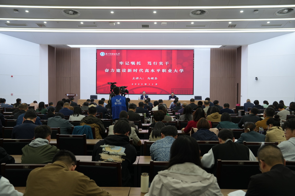 自学习贯彻习近平新时代中国特色社会主义思想主题教育开展以来,校党委持续推动理论学习走深走实,在前期高标准高质量举办读书班,进行全面系统理论学习的基础上,学校领导及中层正职干部纷纷下基层、到一线,紧密结合学校实际和发展所需,精选党课主题,优化党课内容,创新党课形式,带头讲好专题党课。11月8日,校党委书记马顺圣在科技综合楼401报告厅,以“现场+在线直播”的形式,为学校全体党员干部讲授了一堂以“牢记嘱托 笃行实干 奋力建设新时代高水平职业大学”为题的主题教育专题党课。专题党课由校党委副书记陈亚鸿主持。