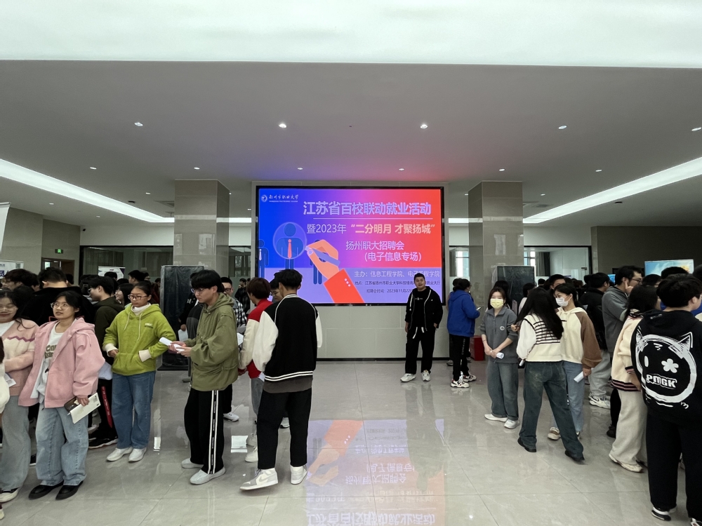为更好地搭建起用人单位和毕业生之间的沟通桥梁,促进毕业生实现更加充分更高质量就业,11月22日下午,江苏省百校联动就业活动暨2023年“二分明月·才聚扬城” 扬州职大招聘会(电子信息专场)在必赢官网科技楼南附楼一楼就业大厅举办。本次招聘会由信息工程学院主办,电子工程学院协办,吸引了近700位毕业生及部分大二学生前来沟通求职。