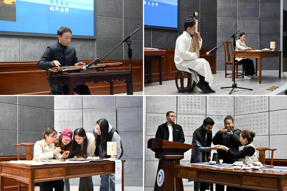 随后,扬州青春非遗表演艺术团的各位老师为在场师生带来了一场非遗文化盛宴。伴随着悠悠的古琴曲和清亮的琵琶弹奏,在场师生仿佛走进一个跨越时空的悠远世界里。同时,为了让大家更加沉浸式体验扬州的世界非物质文化遗产项目,两位非遗表演老师也在现场带来了雕版印刷和魁龙珠茶道展示。表演结束后,现场的各位同学尤其是来华留学生们对非遗文化表现出极大兴趣,纷纷举手上台与老师互动。台上一侧,同学们在老师指导下学习“魁龙珠”茶的冲泡,品龙井透出的“味”、魁针衬出的“劲”、珠兰显出的“香”,留学生们连连称赞“味道很好”。另一侧,同学们在桌边围成一圈学习雕版印刷,并亲自拓印雕版作品,作为本次活动体验的特别礼物。现场气氛活跃,同学们表示非常高兴能近距离体验扬州非遗文化,纷纷与自己的雕版拓印作品合影留念。留学生们也表示,将进一步多渠道了解扬州历史和大运河文化,把扬州故事、运河精神带回自己的家乡。