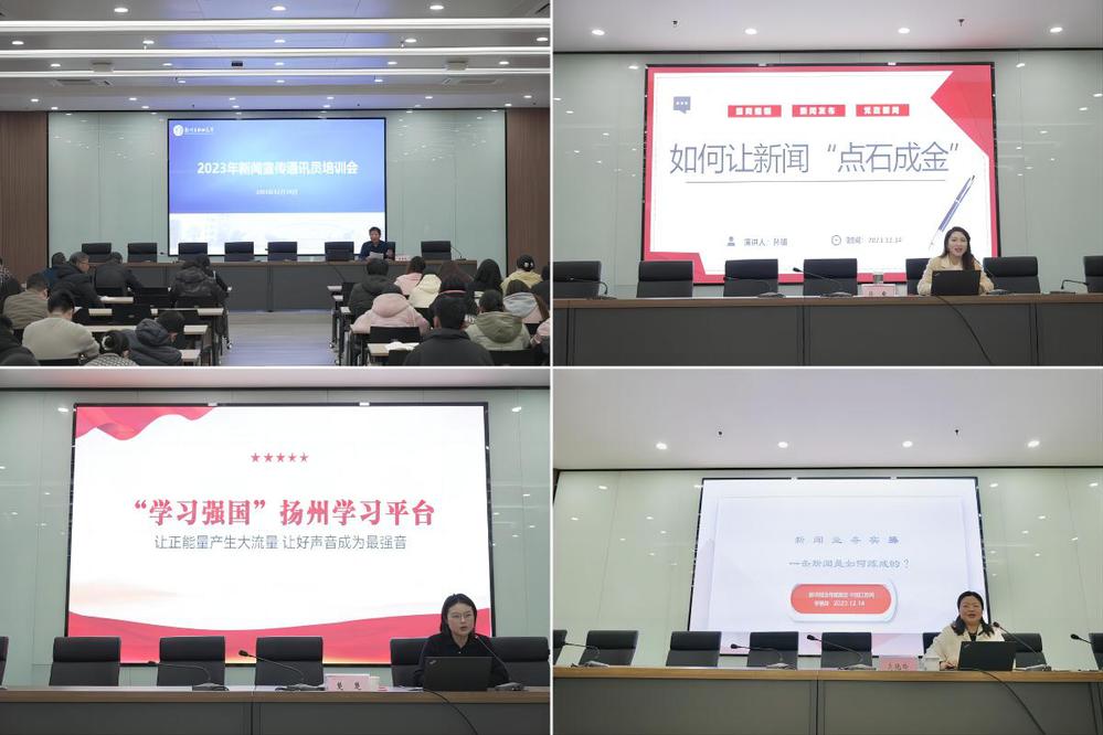 来自中国江苏网教育频道主编、产业事业部副主任李艳玲主任以《一条新闻是如何炼成的》为题,结合多年的新闻工作实践,介绍了如何发现新闻、新闻的几个特性,运用案例重点讲解了如何写好一则消息及会议新闻、人物新闻。学习强国扬州学习平台编辑部主任楚楚提炼了学习强国稿件的写作及供稿要求。扬州广电新闻频道《新闻女生三把叨》主持人孙瑜以《如何让新闻“点石成金”》为题分享写作经验,讲解高质量的融媒体作品创作技巧。扬州冗视频文化传媒有限公司创始人王永从短视频引流手段、用户运营、媒介与用户环境的转变等方面讲解《短视频拍摄与剪辑技巧》。