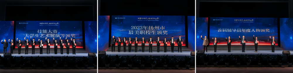 现场对学校首届辅导员年度人物,最美职校生,省技能大赛、创新大赛省赛、省大学生艺术展演及省大学生职业规划大赛等获奖者,2022-2023学年国家奖学金获得者进行了表彰。