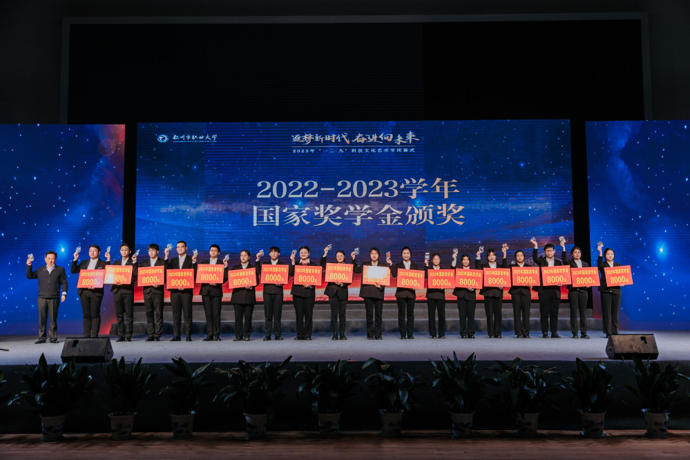学校党委书记马顺圣在闭幕式上代表学校党委、行政,向为活动顺利开展付出辛勤汗水的各位指导教师和全体演职人员表示衷心的感谢并致以诚挚的问候!他介绍,本届“一二·九”科技文化艺术节历时52天,坚持把校园文化活动与专业教育相融合,充分展现了广大师生崇尚科学、弘扬文化、热爱艺术的良好风貌,是学校科技文化育人成果的生动体现。他表示,学校牢牢把握职业教育类型特征,在2023年取得了一系列重要成果,成功入选国家发改委“十四五”教育强国推进工程储备院校清单,立项国家自然科学基金、工信部专精特新产业学院等重大项目;广大学生在实习实训、创新创业、志愿服务中不断磨炼技能、提高本领,先后获全国职业院校技能大赛一等奖,全国大学生创新创业大赛一等奖等。他希望,同学们以参加此次活动为新的起点,永葆“匠心筑梦,技能报国”的初心,积极投身技能学习,不断提升自身本领,在科技创新的舞台上,立大志、担大任,敢为人先、敢于突破,努力为科技创新注入青春力量!