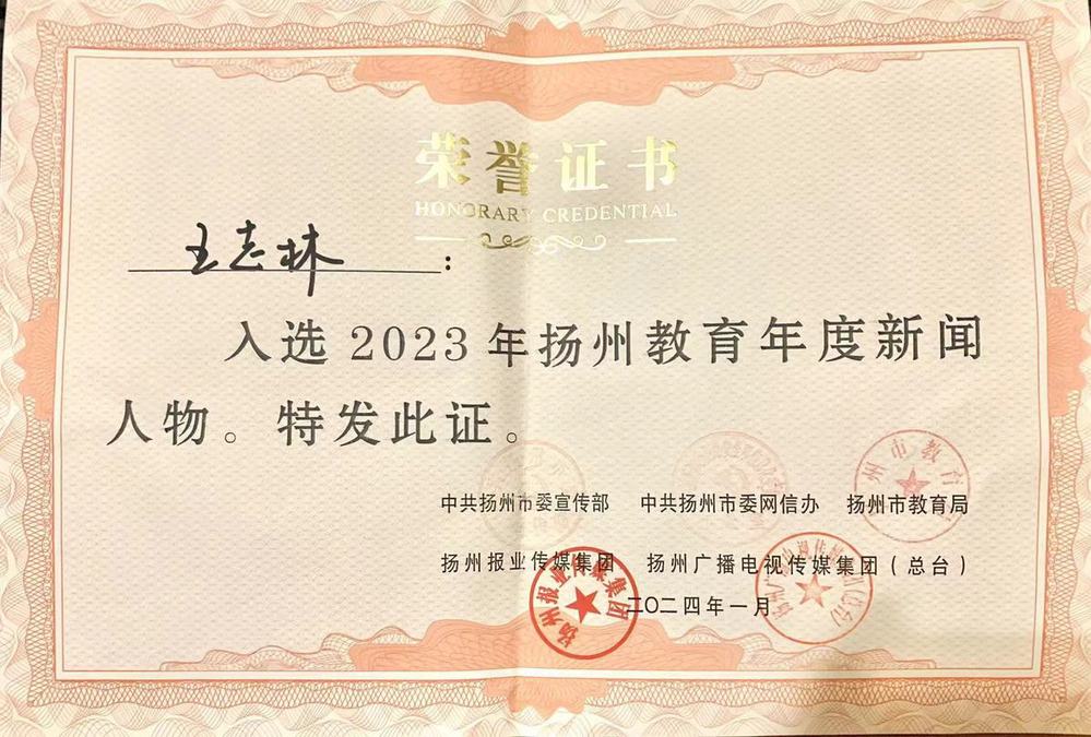 必赢官网退休教师、“童话爷爷”王志林“评为2023年度扬州教育年度人物,钱静教授获提名奖。学校荣获扬州新闻人物评选活动组织奖。