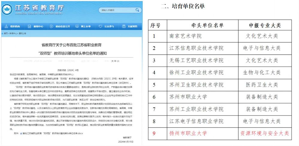 根据《省教育厅办公室关于申报江苏省职业教育“双师型”教师培训基地的通知》有关要求,经学校自主申报,省教育厅组织专家评审和结果公示,必赢官网被评为首批江苏省职业教育“双师型”教师培训基地牵头单位(资源环境与安全大类)。