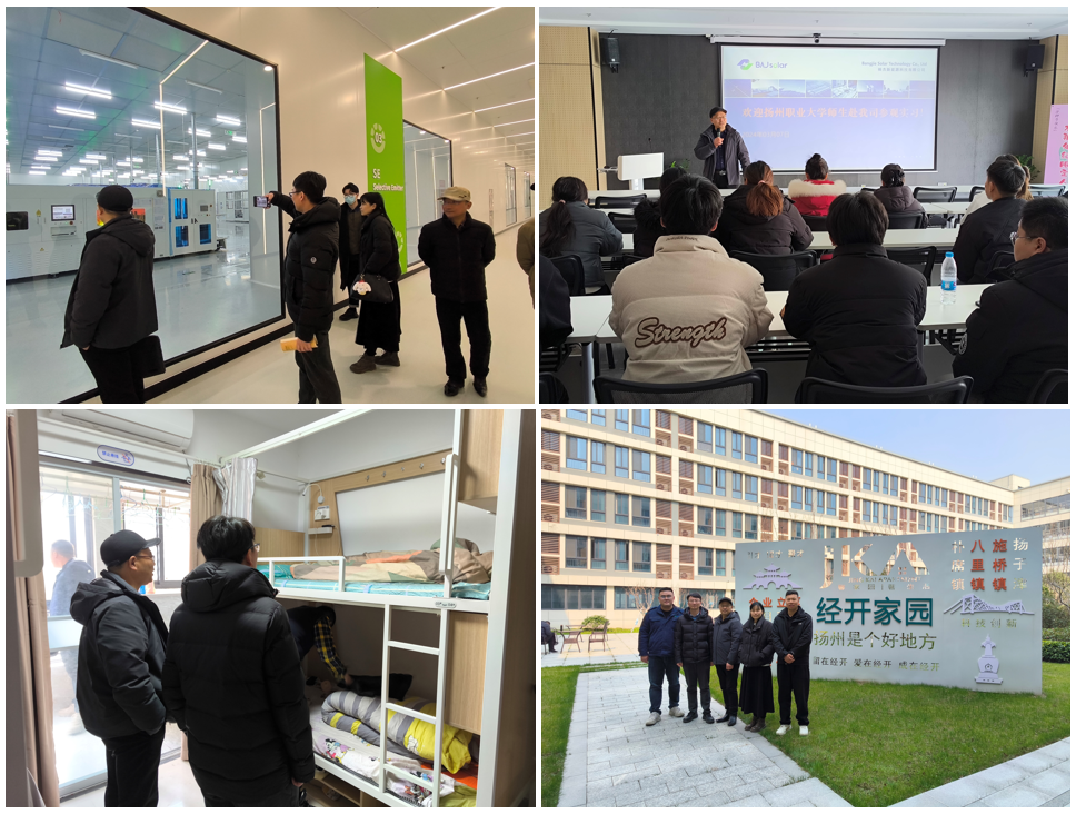 扬州棒杰新能源科技有限公司是一家深耕光伏产业的优质企业,也是电子工程学院毕业生顶岗实习的合作单位之一。今年顶岗实习工作中,学院向该公司输送了近30名2024届应届毕业生,分布于工艺设备维护、品质管理、生产管理等工作岗位。电子工程学院陈久安书记、招生就业处阮文杰副处长等一行七人抵达该公司后,在人事经理张鹏的带领介绍下,参观了该公司的生产线、员工食堂、宿舍等,深入了解学生实习岗位、就业岗位的具体情况。为了让今后的毕业生“零距离”了解公司生产车间、生活区环境,知晓生产线流程、岗位设置等情况,进一步增强毕业生选公司选岗位的信心,双方就“直播带岗”的校企合作新模式进行了交流和探讨,对下一步合作初步达成共识。