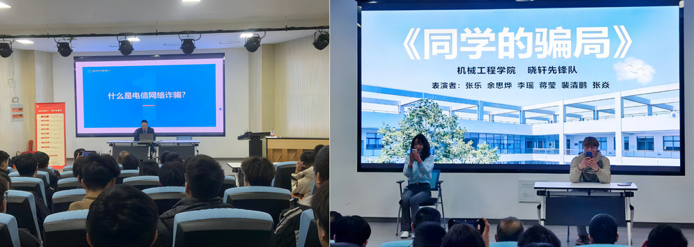 活动现场,机械工程学院学生以饱满的热情认真聆听各位专家老师的讲座。扬州农商银行机关第一党支部的专家用深入浅出的语言,结合生动鲜活的案例,从网络诈骗的定义、特点及危害开始讲起,介绍了常见的诈骗套路和识别防范网络诈骗的方法,讲解了个人信用报告及维护良好信用的重要性。学校审计处党支部黄茜璐老师作了《防就业诈骗》讲座,对大学生求职过程中容易遇到的诈骗风险进行了提醒,并给出了应对措施。机械工程学院学工党支部“晓轩”先锋队的同学们表演了校园防诈骗小品《同学的骗局》,再现校园诈骗经典案例,现场笑声不断,引发了同学们的共鸣和反思,起到了寓教于乐的良好效果。