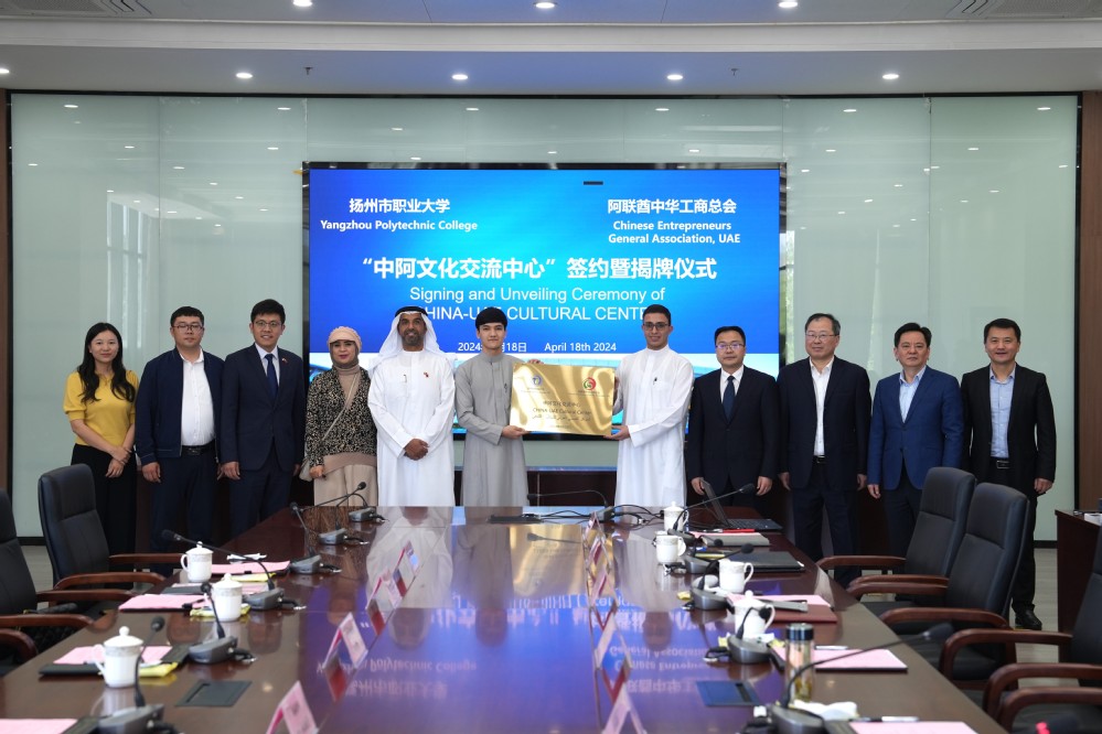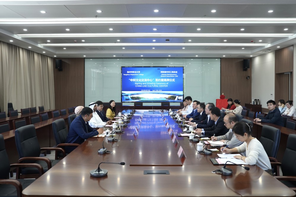 朱明涛对学校的热情接待表示衷心的感谢。他介绍,阿联酋政府计划在100所公立学校启动中文教学项目,这对中阿教育交流与合作具有战略意义。文化交流中心的成立,不仅为双方提供一个互相学习、互相了解的平台,更将推动双方在教育、文化、经贸等领域的深入合作。他表示,中华工商总会将发挥桥梁纽带的作用,加强与扬州市职业大学的合作,通过“中阿文化交流中心”让更多的阿联酋人民了解中国特别是扬州的历史、文化、教育和社会发展,同时也让扬州的师生以及社会各界有机会深入了解阿拉伯世界,共同致力于中阿两国的友谊与合作。